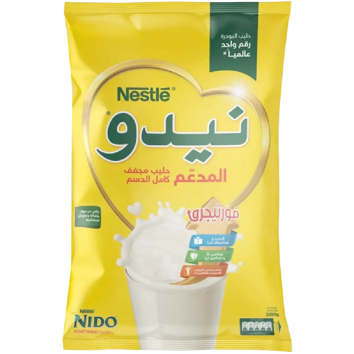 نيدو فورتيفيد مع فورتيجرو هو مسحوق حليب كامل الدسم غني ولذيذ. تحتوي كل ملعقة من مسحوق حليب نيدو فورتيفيد مع فورتيجرو على: بروتين عالي الجودة ضروري لنمو عضلات الجسم. الكالسيوم وفيتامين د للحفاظ على عظام وأسنان طبيعية. الحديد وفيتامين سي لدعم التطور المعرفي عندما تعطي طفلك نيدو فورتيفيد مع فورتيجرو، فإنك تقدم مزيجًا من الحليب ذي المذاق الرائع والعناصر الغذائية الأساسية التي تدعم نمو طفلك وتطوره بشكل عام، على أكمل وجه.